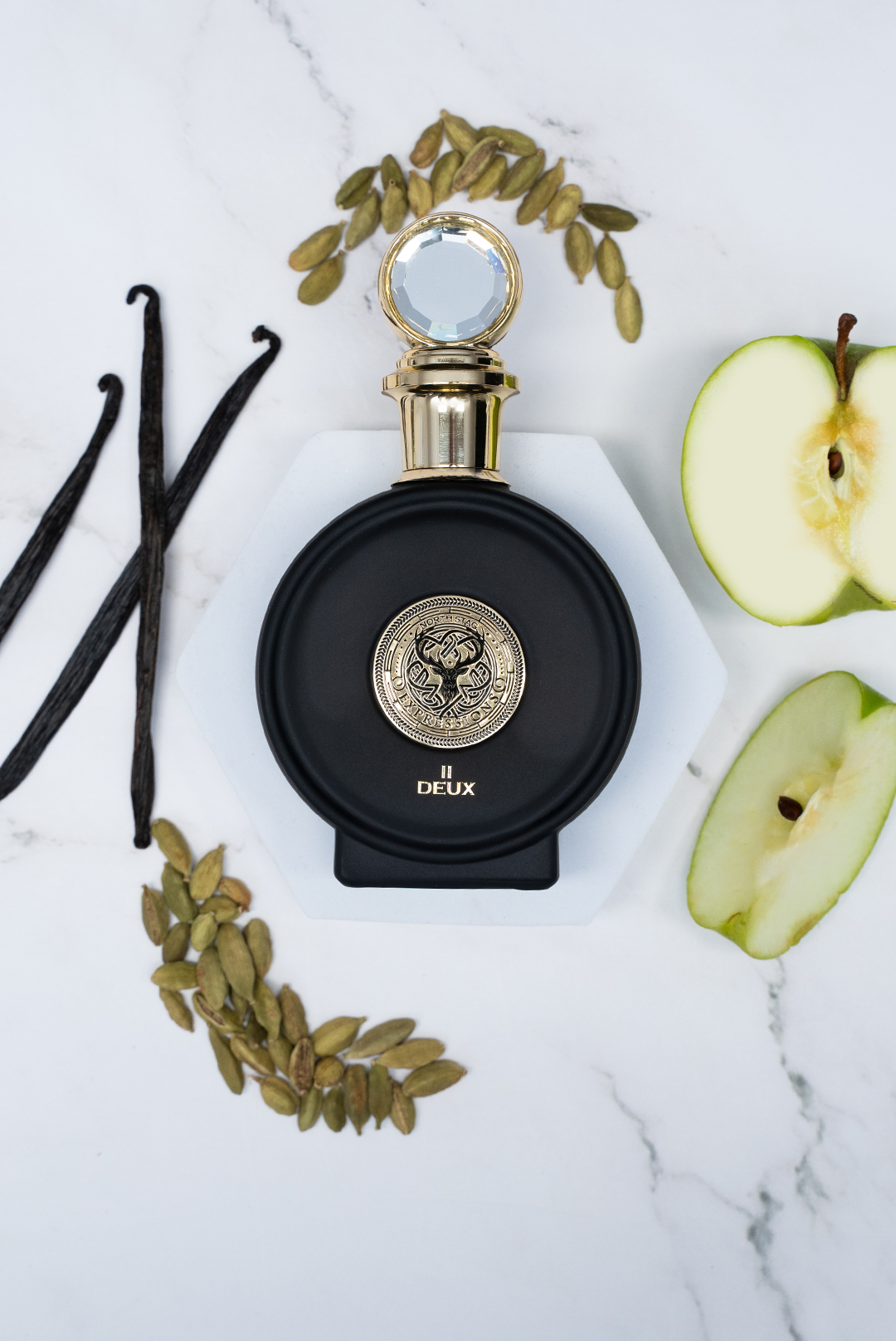 La finale, un crescendo boisé et épicé, dévoile les secrets d’une nuit étoilée. La vanille, voluptueuse, flirte avec la cardamome mystérieuse et le poivre, un baiser épicé sous les étoiles. Le bois de santal et le bois de gaiac tissent un voile de mystère, tandis que le patchouli, tel un écho lointain, ancre ce parfum dans une mémoire éternelle.
